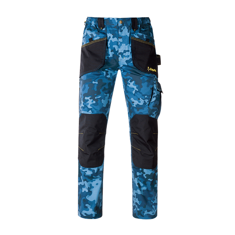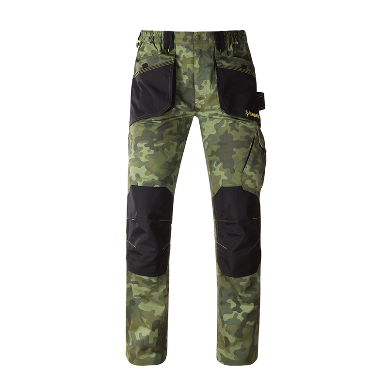 • Available in solid black, light grey with black knees and pockets or camouflage effect in either camo blue or camo green.